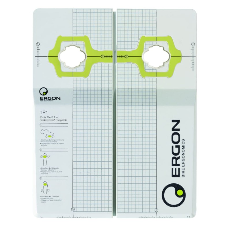 Narzędzie Ergon TP1 Pedal Cleat Tool jest szablonem, który pozwala na niezwykle precyzyjne ustawienie bloków SPD w twoich butach. Teraz symetryczne ustawienie bloków w obu butach stało się dziecinnie proste. Dokładne ustawienie jest możliwe dzięki siatce naniesionej na powierzchnię szablonu. Dzięki narzędziu Ergon TP1 można znacznie przyspieszyć montaż bloków w serwisie rowerowym, gdzie przecież liczy się czas i skuteczność. W zestawie znajduje się również podręcznik. Podręcznik jest istotnym elementem zestawu, jednak należy mieć na uwadze, że jest dostępny tylko w językach ANGIELSKIM, NIEMIECKIM i FRANCUSKIM - tłumaczenie na język POLSKI nie jest na razie przewidywane. Podręcznik ten wyjaśnia ciekawe i istotne zagadnienia z dziedziny biomechaniki i ergonomii. Na każdym etapie można znaleźć "porady eksperta", które pomagają maksymalnie wykorzystać energię ludzkich mięśni na pedałowanie, właściwe ułożenie nóg i stóp, itp.