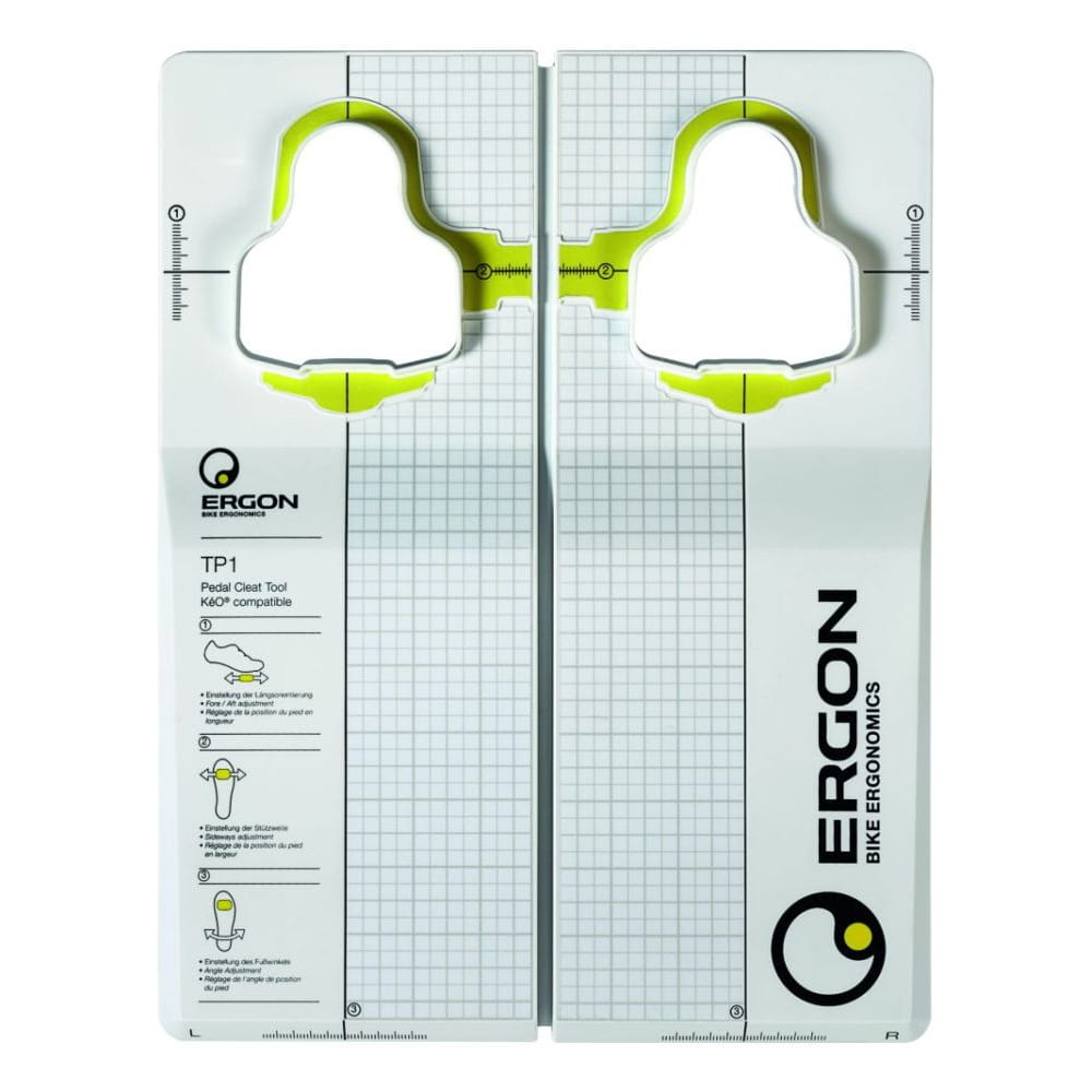 Narzędzie Ergon TP1 Pedal Cleat Tool jest szablonem, który pozwala na niezwykle precyzyjne ustawienie bloków Look KeO w twoich butach. Teraz symetryczne ustawienie bloków w obu butach stało się dziecinnie proste. Dokładne ustawienie jest możliwe dzięki siatce naniesionej na powierzchnię szablonu. Dzięki narzędziu Ergon TP1 można znacznie przyspieszyć montaż bloków w serwisie rowerowym, gdzie przecież liczy się czas i skuteczność. W zestawie znajduje się również podręcznik. Podręcznik jest istotnym elementem zestawu, jednak należy mieć na uwadze, że jest dostępny tylko w językach ANGIELSKIM, NIEMIECKIM i FRANCUSKIM - tłumaczenie na język POLSKI nie jest na razie przewidywane. Podręcznik ten wyjaśnia ciekawe i istotne zagadnienia z dziedziny biomechaniki i ergonomii. Na każdym etapie można znaleźć "porady eksperta", które pomagają maksymalnie wykorzystać energię ludzkich mięśni na pedałowanie, właściwe ułożenie nóg i stóp, itp.