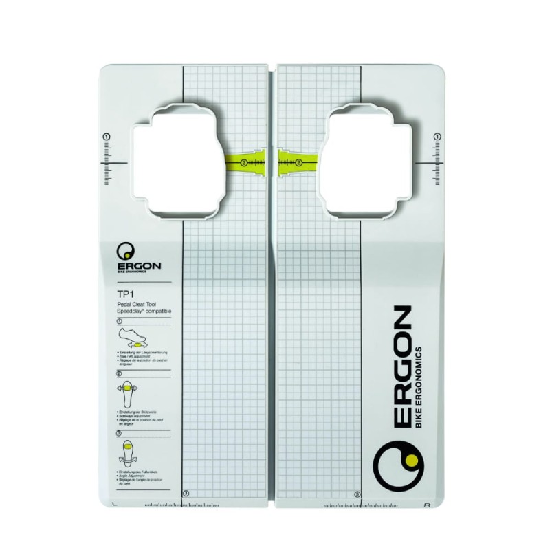 Narzędzie Ergon TP1 Pedal Cleat Tool jest szablonem, który pozwala na niezwykle precyzyjne ustawienie bloków SPD w twoich butach. Teraz symetryczne ustawienie bloków w obu butach stało się dziecinnie proste. Dokładne ustawienie jest możliwe dzięki siatce naniesionej na powierzchnię szablonu. Dzięki narzędziu Ergon TP1 można znacznie przyspieszyć montaż bloków w serwisie rowerowym, gdzie przecież liczy się czas i skuteczność. W zestawie znajduje się również podręcznik. Podręcznik jest istotnym elementem zestawu, jednak należy mieć na uwadze, że jest dostępny tylko w językach ANGIELSKIM, NIEMIECKIM i FRANCUSKIM - tłumaczenie na język POLSKI nie jest na razie przewidywane. Podręcznik ten wyjaśnia ciekawe i istotne zagadnienia z dziedziny biomechaniki i ergonomii. Na każdym etapie można znaleźć "porady eksperta", które pomagają maksymalnie wykorzystać energię ludzkich mięśni na pedałowanie, właściwe ułożenie nóg i stóp, itp.
