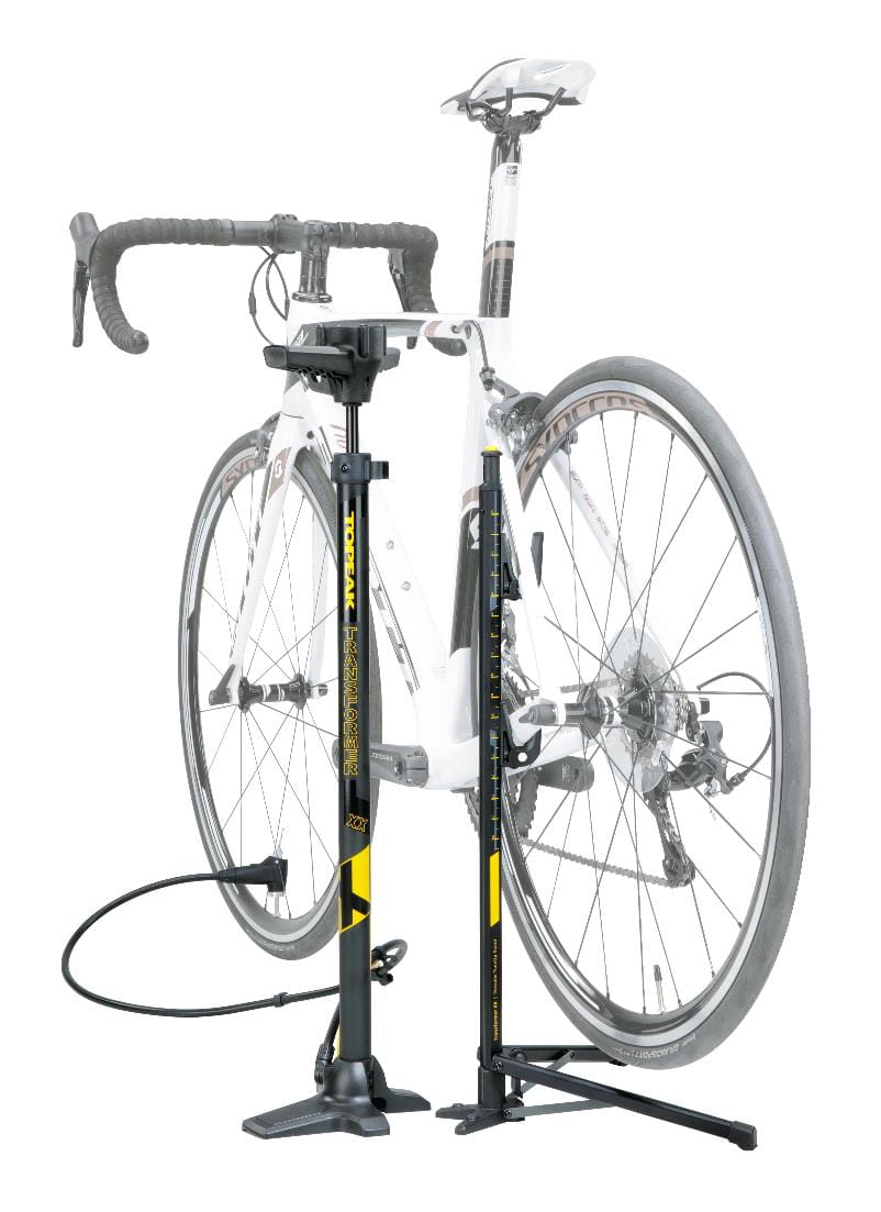 Przenośna pompka do roweru pełniąca jednocześnie funkcję stojaka. Doskonała do przenoszenia i przechowywania.