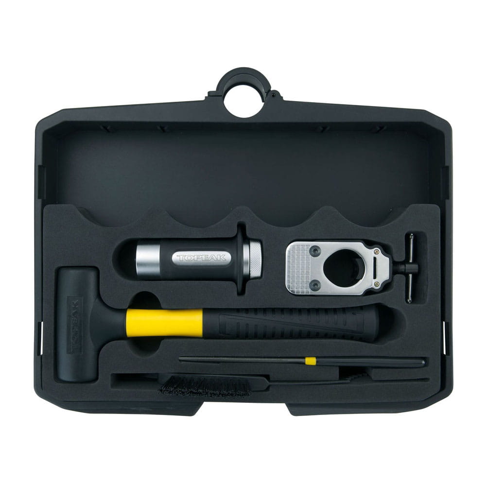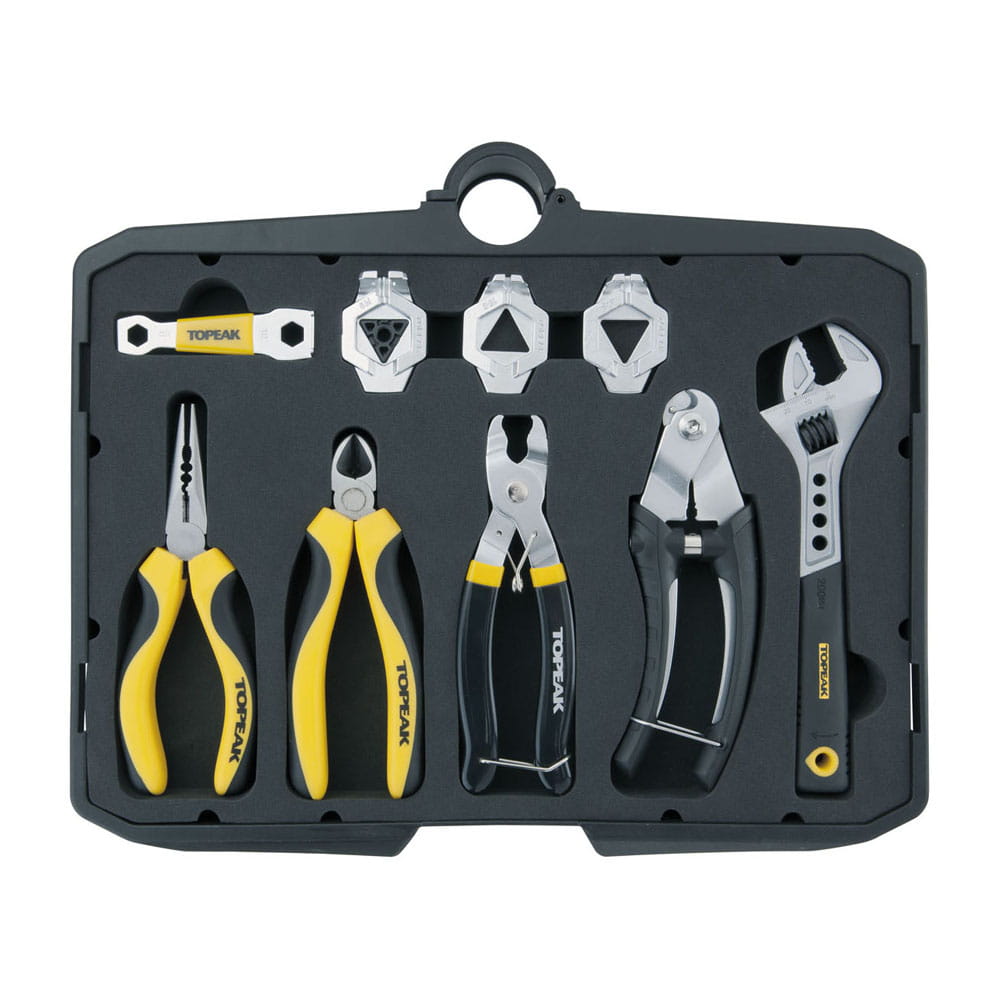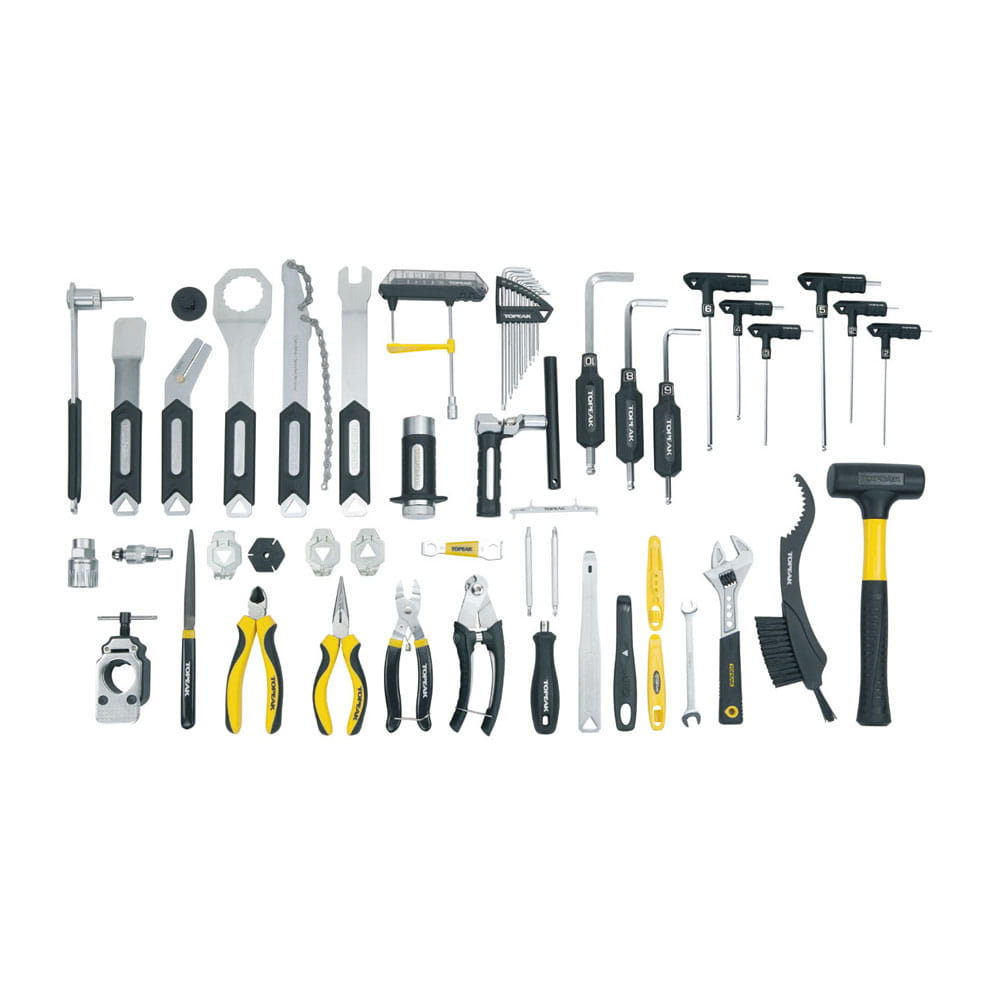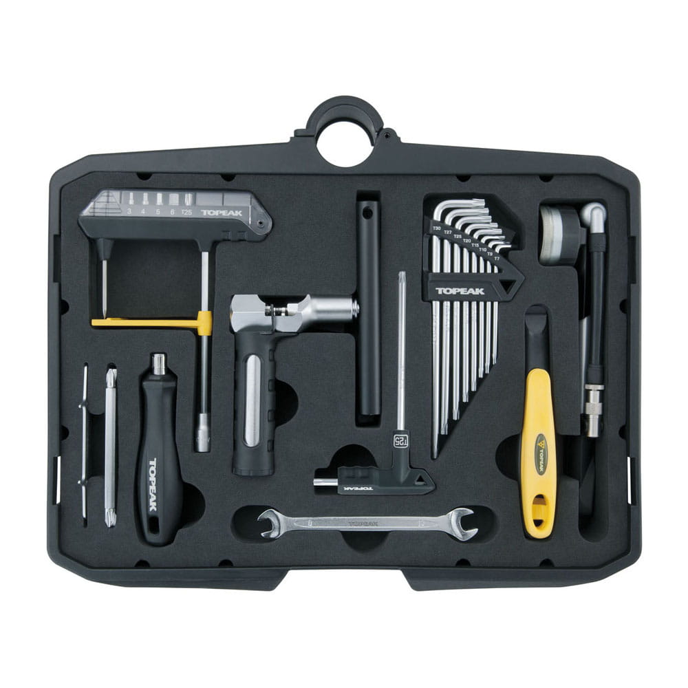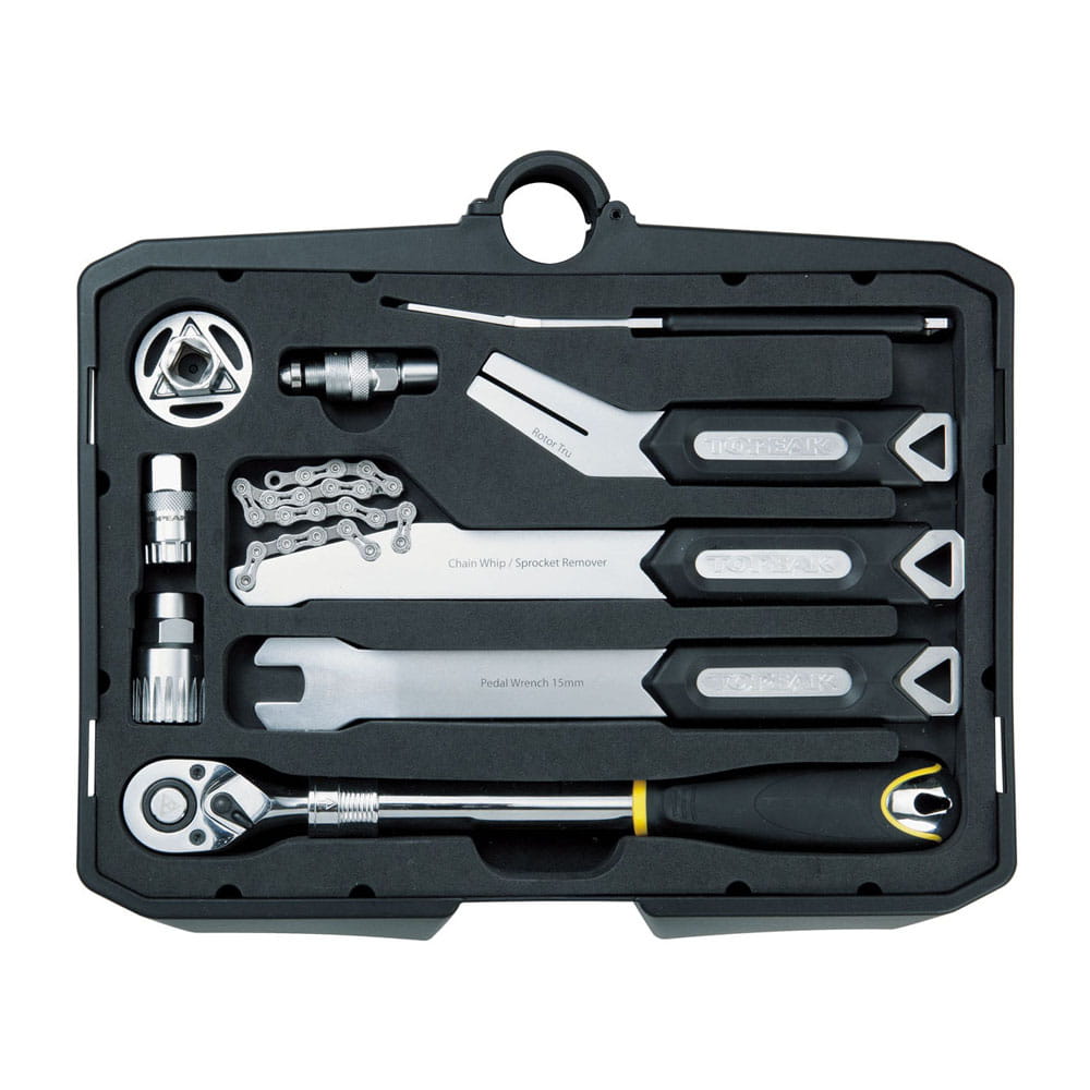 Mobilny wózek narzędziowy z 5" kołami zawierający 6 kaset z zestawem 52 narzędzi profesjonalnej jakości dla serwisów rowerowych. Podstawę z kołami można łatwo wyjąć w celu zwiększenia stabilności. Aluminiowa rączka może być złożona i zablokowana w pozycji ułatwiającej włożenie do samochodu lub ciężarówki. Można odblokować i przedłużyć rączkę aby łatwo przemieszczać wózek. Idealny do sklepów rowerowych, imprez wyścigowych lub konserwacji roweru w domu.