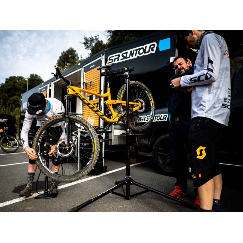 Stojak warsztatowy do roweru ze stabilną statywową podstawą z szybkozamykaczem, składany do małych rozmiarów w celu przechowywania lub transportu. Skonstruowany z bardzo wytrzymałych aluminiowych rur ze stopu 6061 T6. Rotacja uchwytu w zakresie 360°, posiada dodatkowo miękkie i trwałe gumowe szczęki.