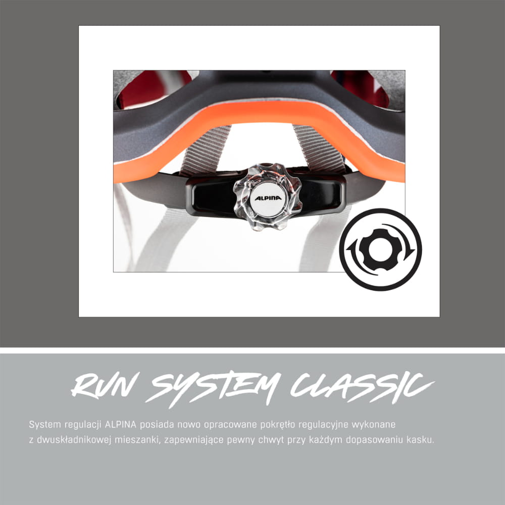 - Run System Classic - System Run umożliwia dostosowanie wszystkich kasków Alpina do niestandardowego rozmiaru głowy za pomocą łatwego w obsłudze pokrętła