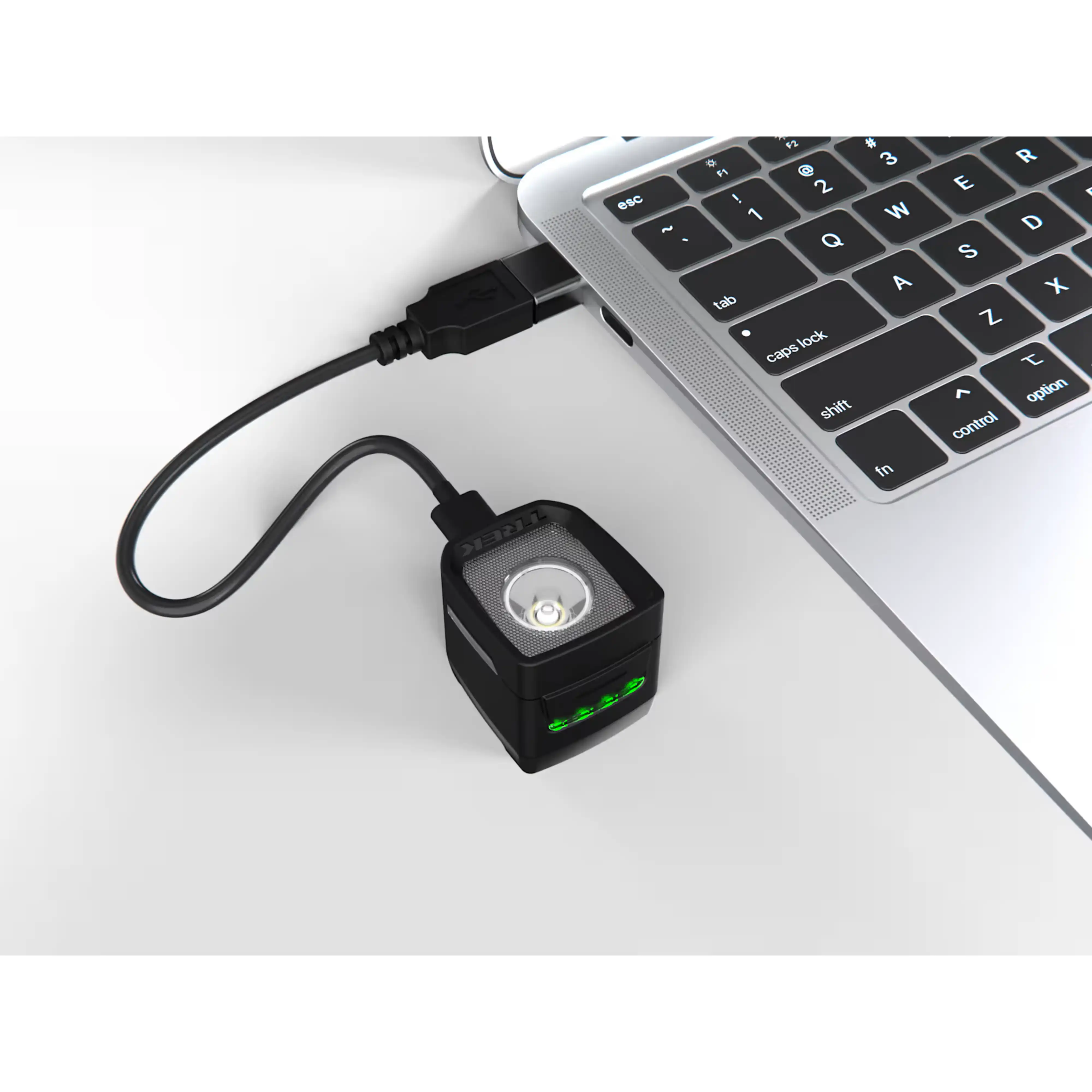 - Wysoka moc 100 lumenów – 2 godz., niska moc 5 lumenów – 20 godz., miganie dzienne 100 lumenów – 9 godzin, czas ładowania godz.