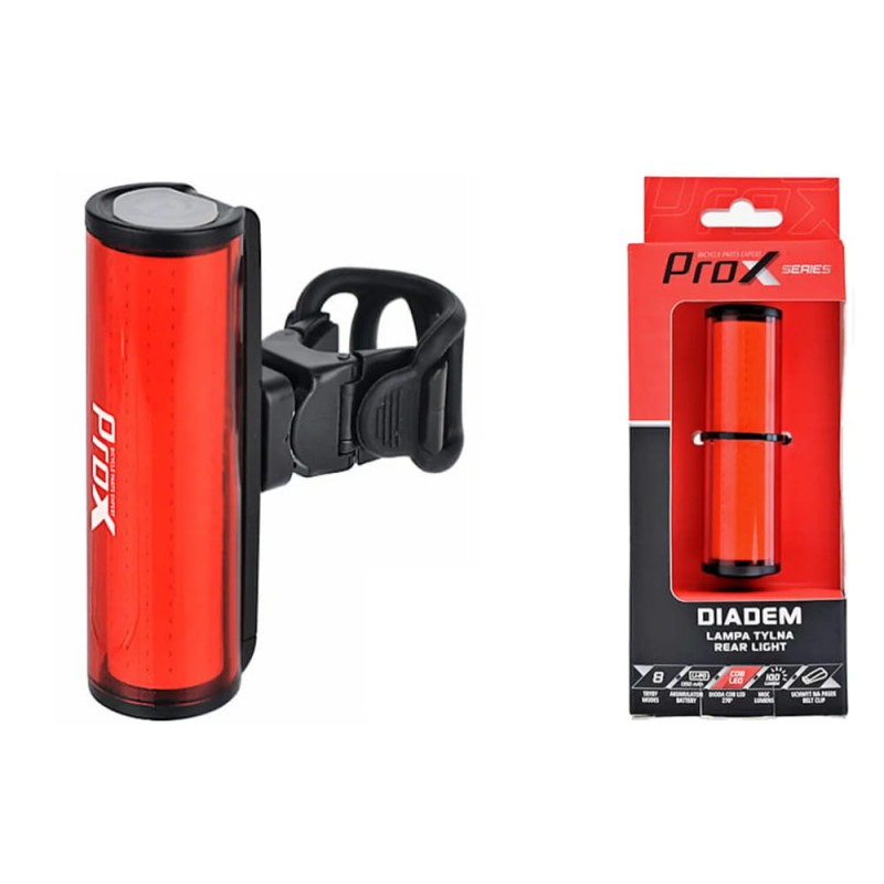 Tylna lampka rowerowa Prox Diadem Cob Led została stworzona z myślą o rowerzystach, którzy często decydują się ruszyć za miasto. Oferuje mocny strumień świetlny, szeroki kąt świecenia, kilka trybów oraz solidny akumulator, co sprawia, że jest jedną z ciekawszych propozycji w swojej klasie. Cechuje się dużą wytrzymałością i ciekawym designem. Lekką konstrukcję wykonano z wysokiej jakości tworzywa ABS, który jest znacznie bardziej odporny na uszkodzenia niż plastik. Prox Diadem posiada klasę wodoodporności IPX4. Jasna dioda Cob Led gwarantuje moc 1000 lumenów oraz bardzo szeroki kąt świecenia do 270 stopni. Lampka posiada 8 zróżnicowanych pod względem intensywności trybów świecenia (stałych lub migających). Dużym udogodnieniem jest funkcja Memory Mode, która zapamiętuje ostatnio wybierane ustawienia.