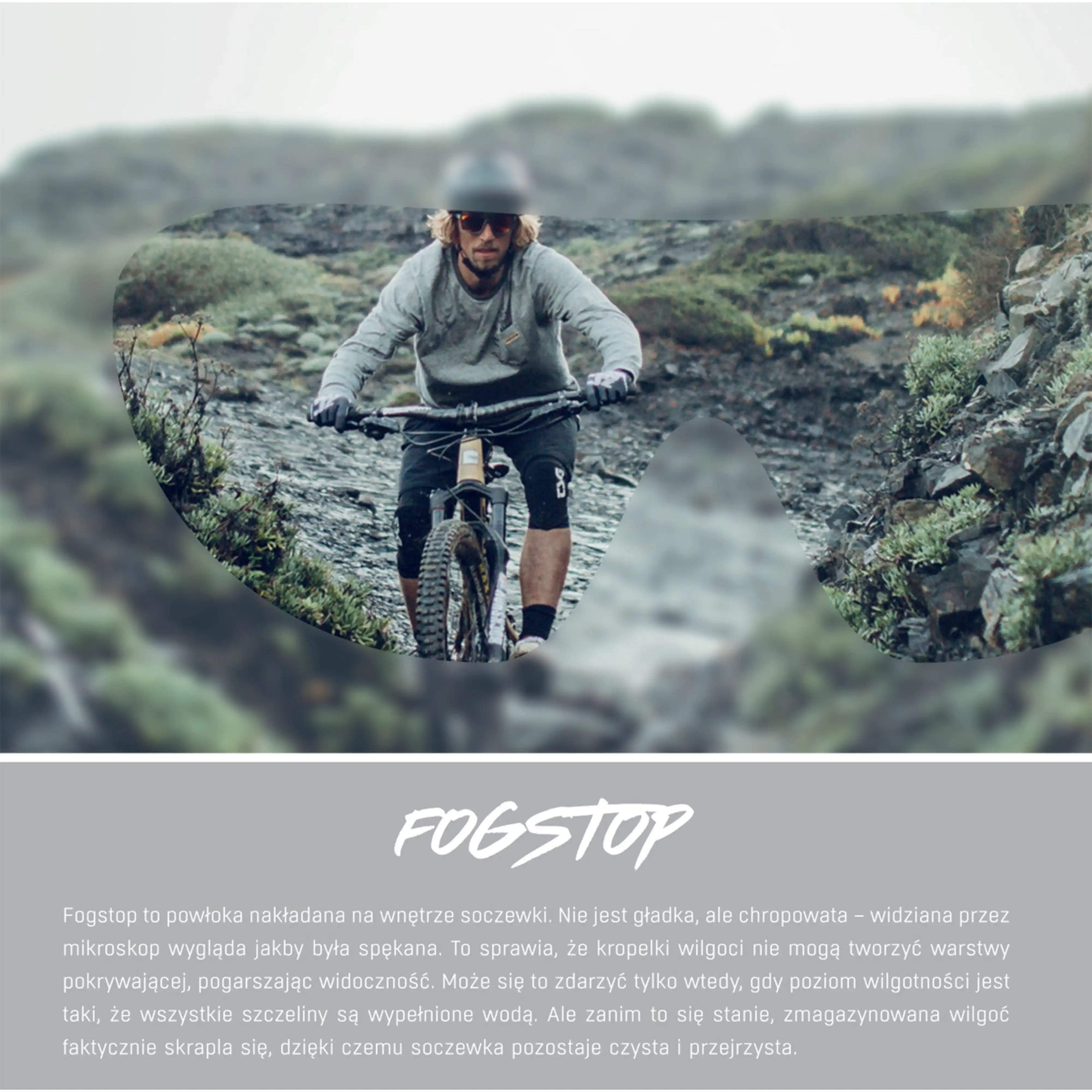 - FOGSTOP – wewnętrzna powłoka przeciwmgielna zapobiega parowaniu soczewek podczas intensywnej aktywności.