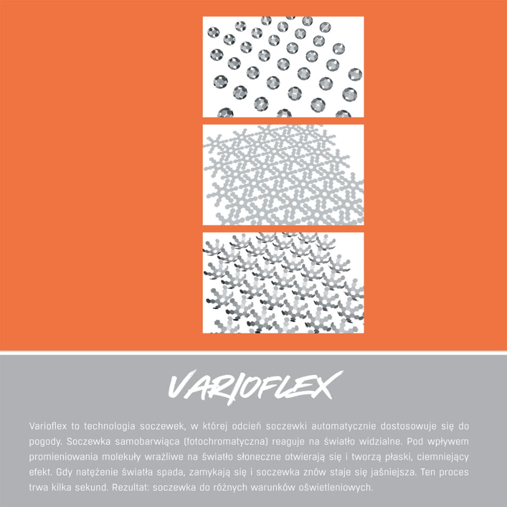 - Varioflex - Technologia Varioflex optymalnie dostosowuje odcień soczewki do warunków oświetlenia (fotochrom).