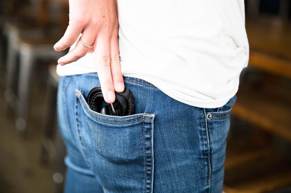 Pasek LEASH możesz podłączyć do paska lub szlufki od spodni mając dodatkowe zabezpieczenie w przypadku upuszczenia aparatu.