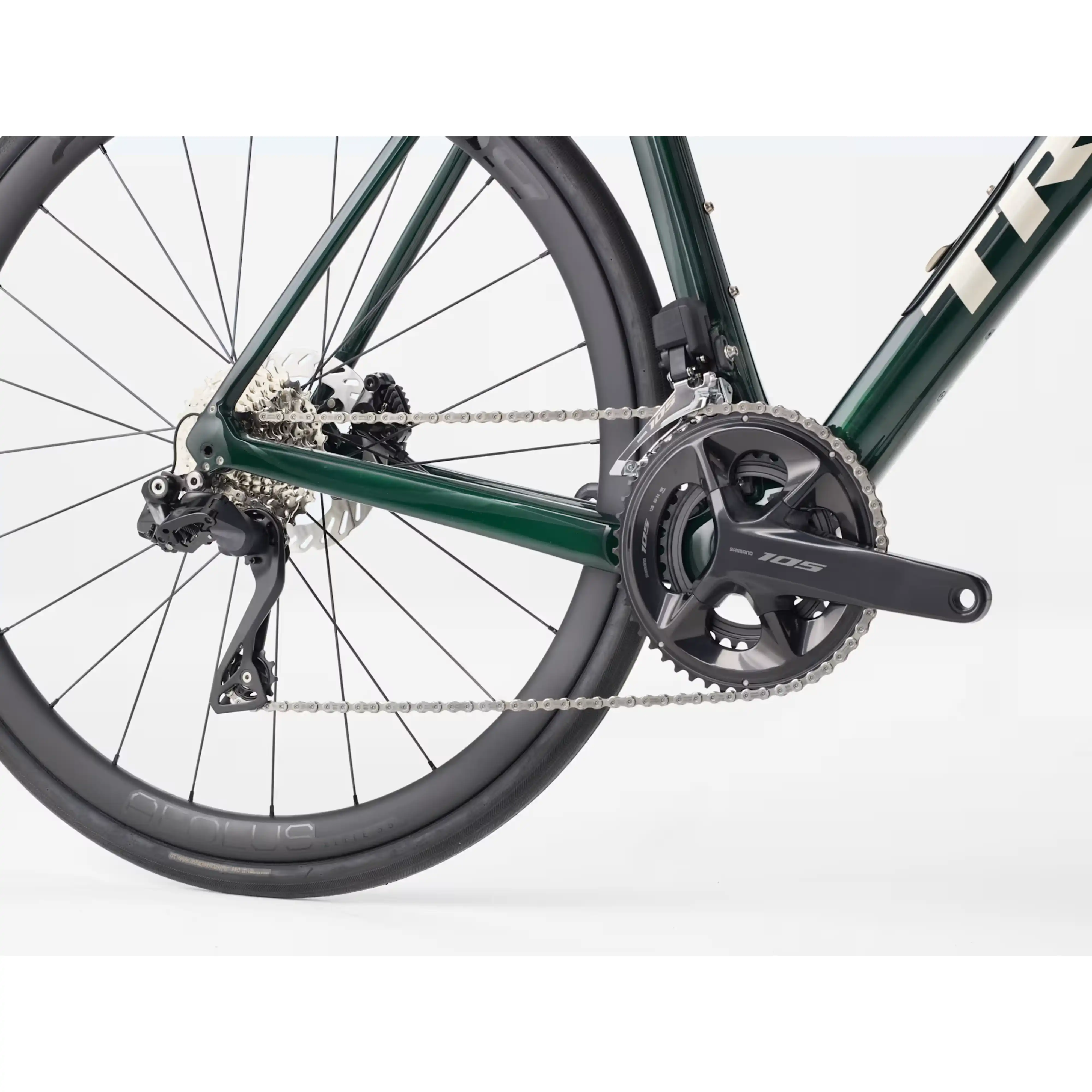 Za efektywność jazdy odpowiadają karbonowe koła Bontrager Aeolus Elite 35 o aerodynamicznym profilu, które oferują doskonały balans między sztywnością, wagą i stabilnością. Opony Tubeless Ready o szerokości 32 mm zwiększają komfort i przyczepność, a możliwość zastosowania jeszcze szerszych opon (do 38 mm) daje dużą swobodę w dostosowaniu roweru do różnych warunków.
