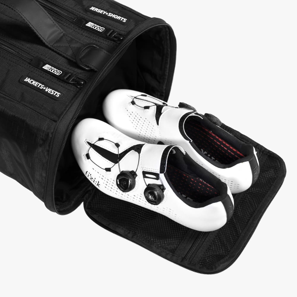 Zadbaj o kompletność i doskonałą organizację swojej odzieży rowerowej i akcesoriów dzięki czarnej torbie przeciwdeszczowej Scicon Essentials Race. Nie pozwól, aby wzmianka o „deszczu” Cię zniechęciła. „Borsa del freddo” tłumaczy się z języka włoskiego dosłownie na worek na zimno – a właściwie worek na worek na zimno lub worek na deszcz. Torba przeciwdeszczowa ma mniej więcej rozmiar dużego pudełka na buty i jest wykonana z miękkiej, rozciągliwej tkaniny. Kompaktowy rozmiar i sześć wyraźnie oznaczonych kieszeni, jedna na każdym końcu, dwie na górze i dwie pod spodem. Wyścigowy worek przeciwdeszczowy jest zaskakująco wytrzymały.
