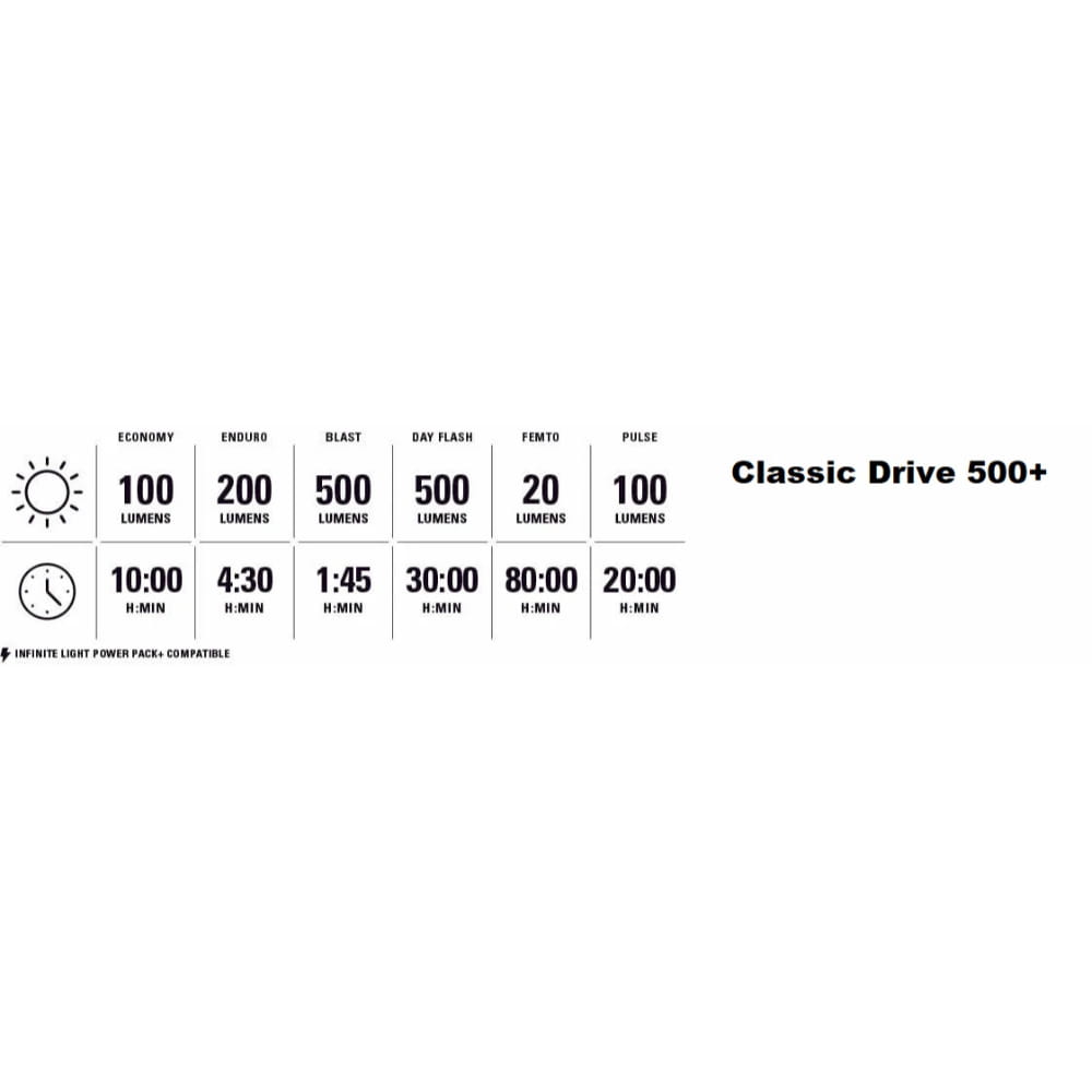 Klasyczne światło rowerowe z nowoczesnym akcentem, Classic Drive 500+ emituje 500 lumenów (lub do 80 godzin pracy) za pośrednictwem pojedynczego emitera LED o dużej mocy. Zostało zbudowane wokół eleganckiej cylindrycznej obudowy, która oferuje kompaktowy i lekki współczynnik kształtu.
