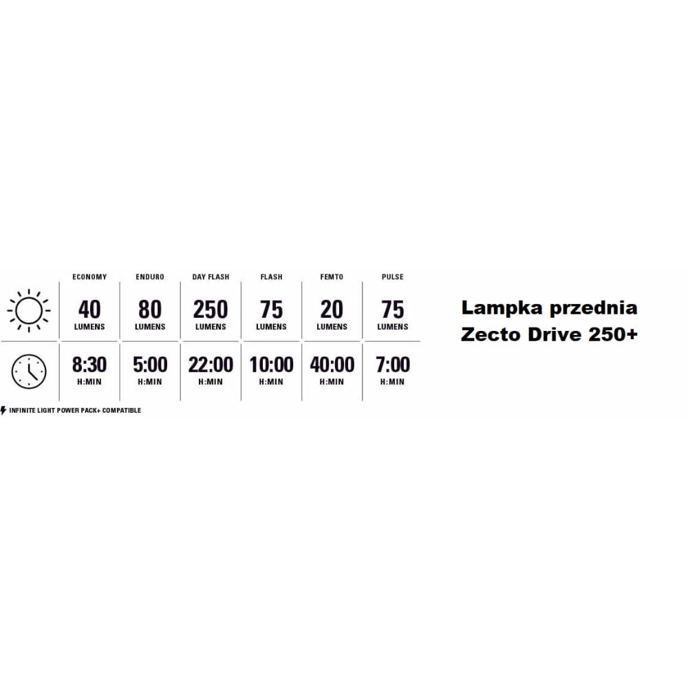 Jest rygorystycznie testowane zgodnie ze standardami wodoodporności IPX7, aby wytrzymać nawet najtrudniejsze warunki pogodowe. Dzięki pojemności baterii 650 mAh Zecto Drive 250+ Front oferuje maksymalny czas pracy do 40 godzin w trybie Femto. Posiada również wodoodporne ładowanie USB-C (kabel nie jest dołączony), dzięki czemu można je łatwo naładować i być gotowym do użycia.