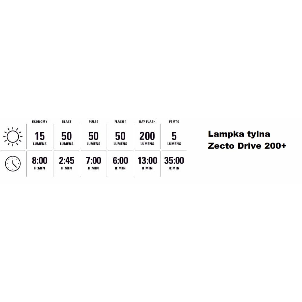 Jest rygorystycznie testowane zgodnie ze standardami wodoodporności IPX7, aby wytrzymać nawet najtrudniejsze warunki pogodowe. Dzięki pojemności baterii 650 mAh Zecto Drive 200+ Rear oferuje maksymalny czas pracy do 35 godzin w trybie Femto. Posiada również wodoodporne ładowanie USB-C (kabel nie jest dołączony), dzięki czemu można je łatwo naładować i być gotowym do użycia.